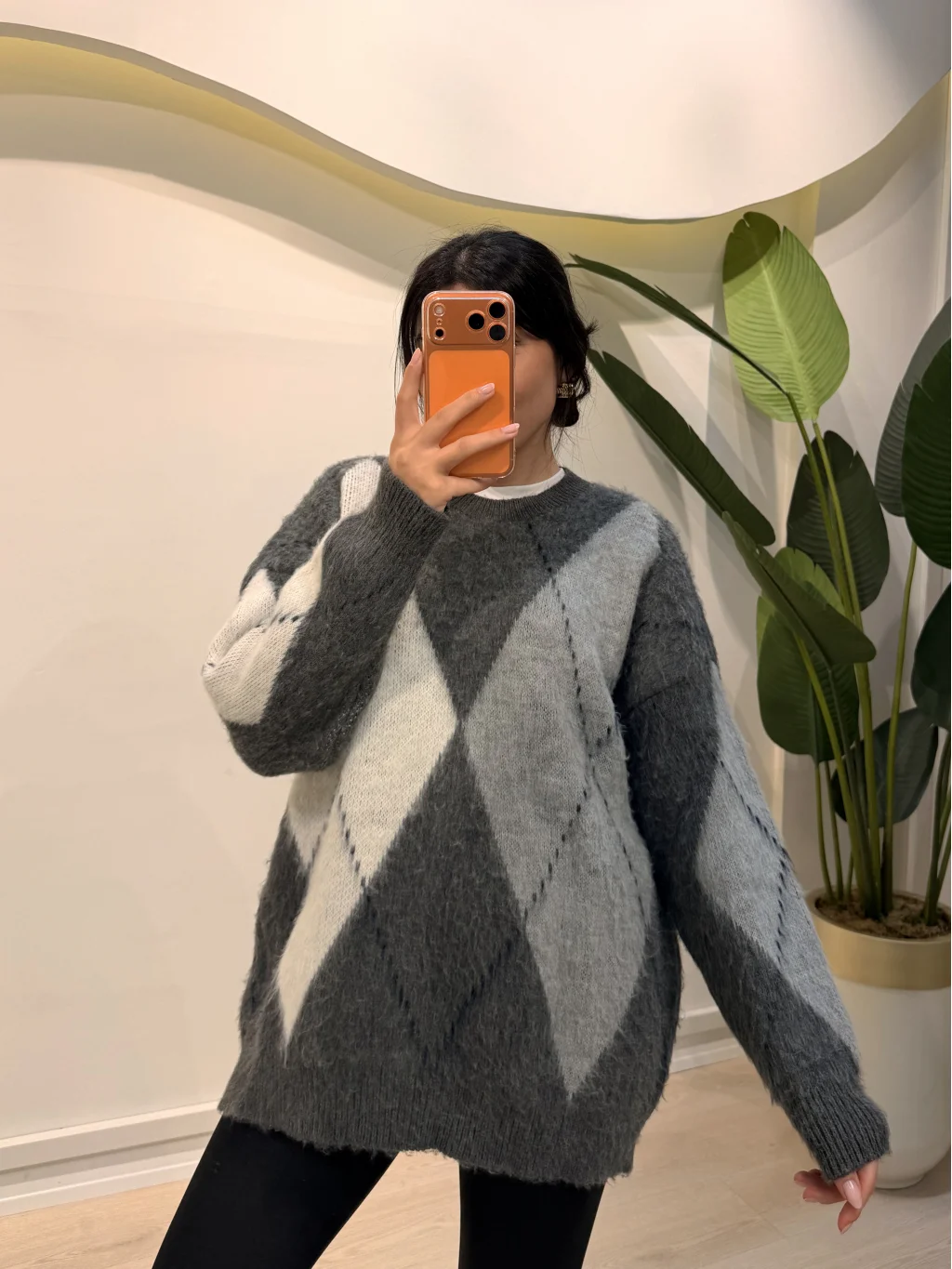 Şık ve rahat Baklava Desen Salaş Kazak - Gri ile kışın tarzınızı tamamlayın.