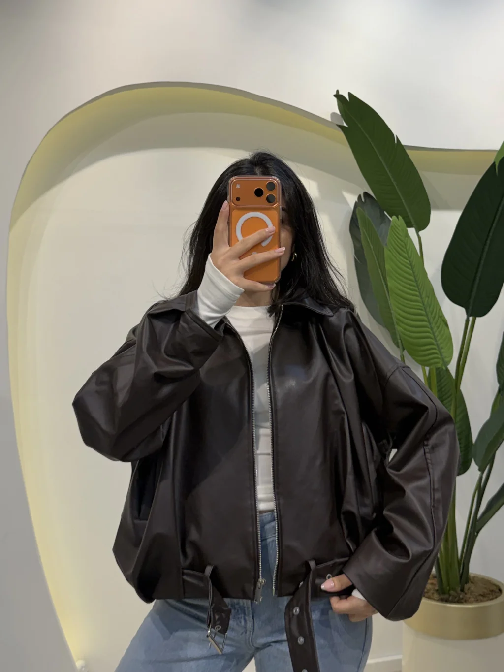 İkonik tarzıyla ön plana çıkan Beli Kemerli Bomber Deri Ceket, şıklık ve rahatlığı bir arada sunar.