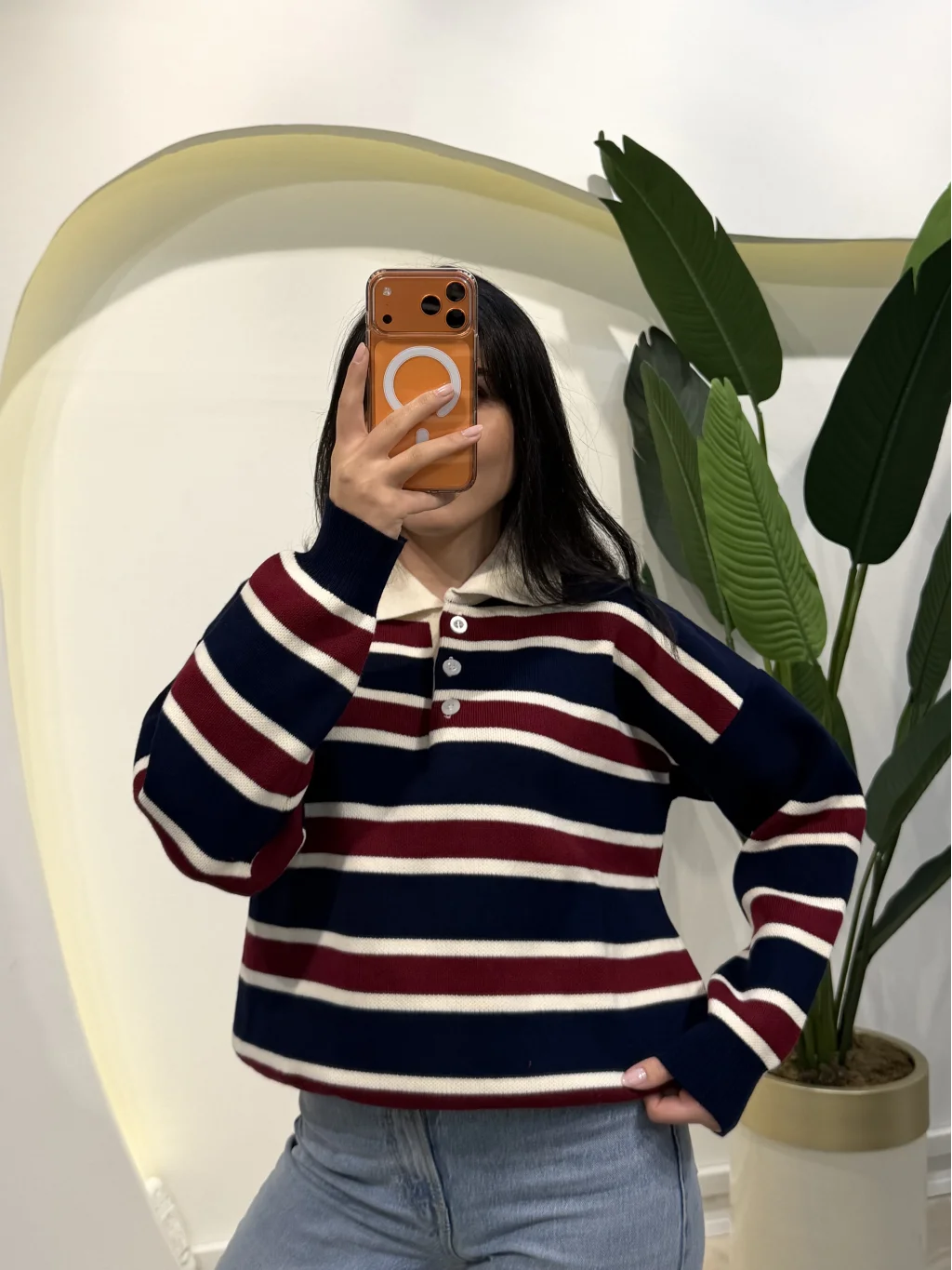 Lacivert Çizgili Polo Yaka Kazak - Şıklığı ve rahatlığı bir arada sunar.