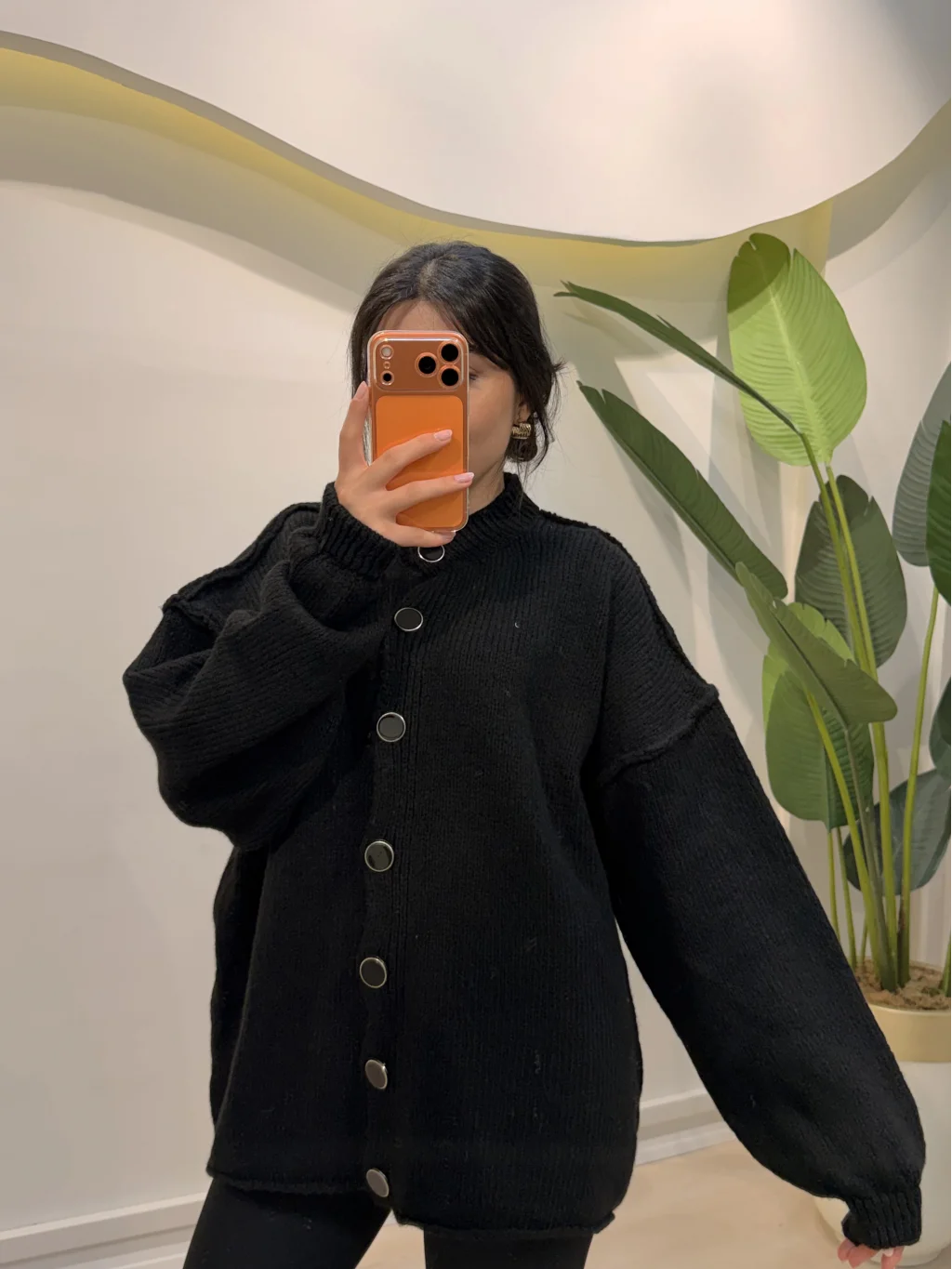 Düğmeli Balon Kol Hırka - Siyah, stilinizi tamamlayacak şık ve rahat bir seçenek.