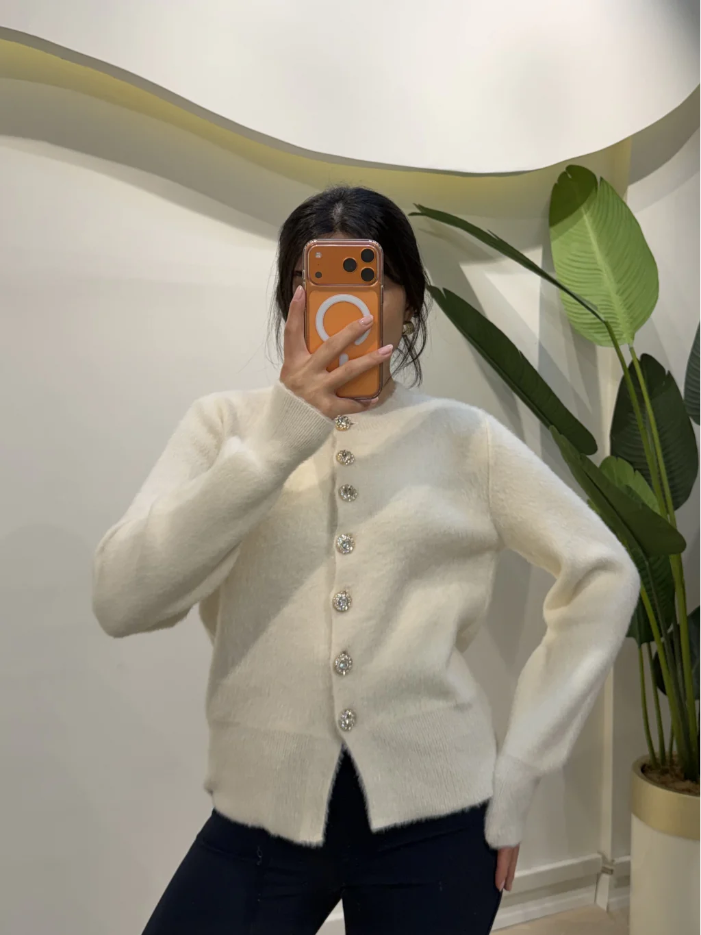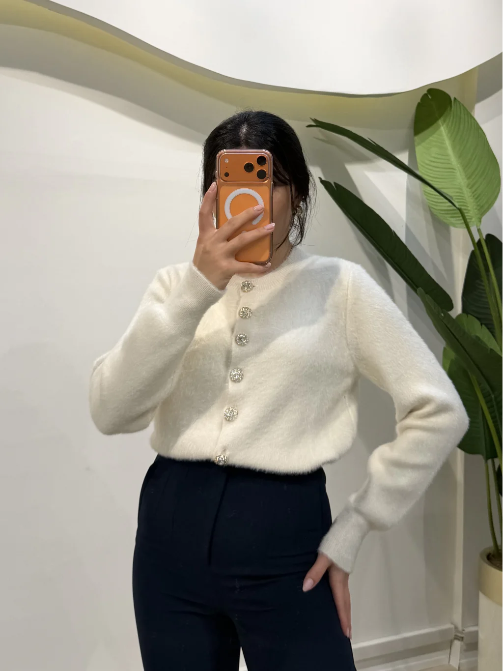 Elmas Düğmeli Sakallı Hırka - Ekru