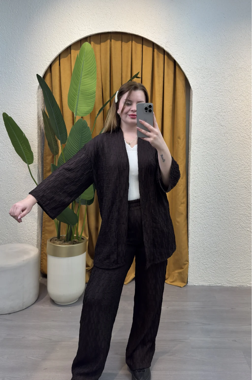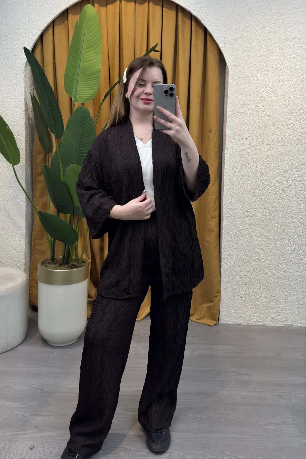 • Şıklığı ve rahatlığı bir arada sunan İkili Bürümcük Kimono Takım - ACI KAHVE gardırobunuzun vazgeçilmezi olmaya aday!