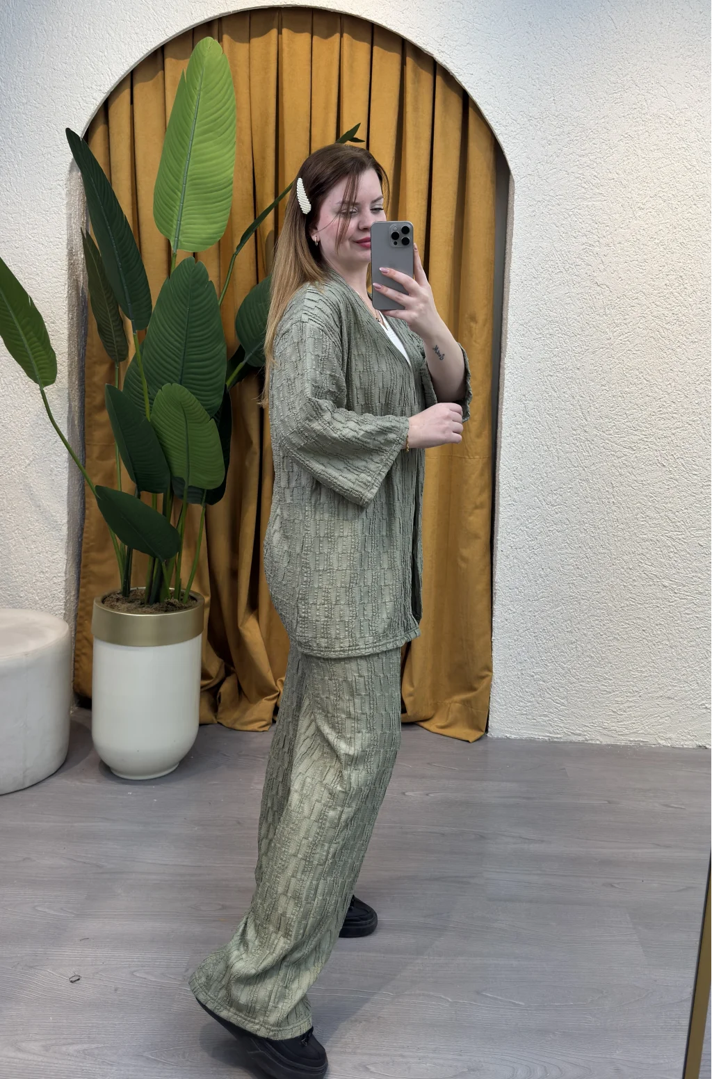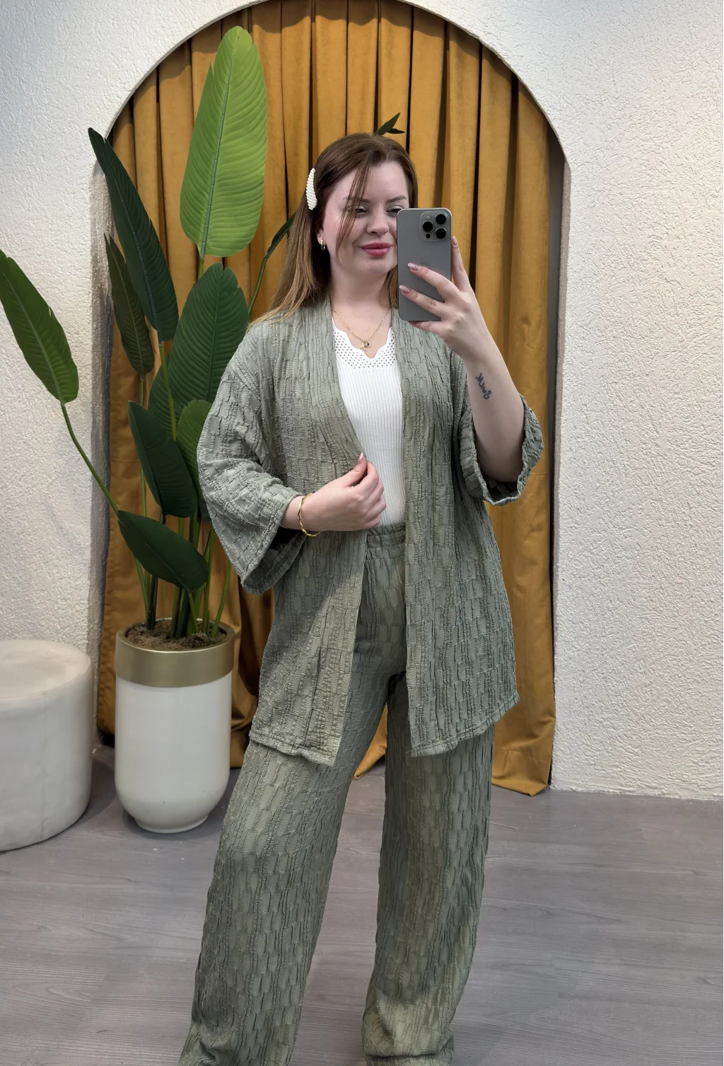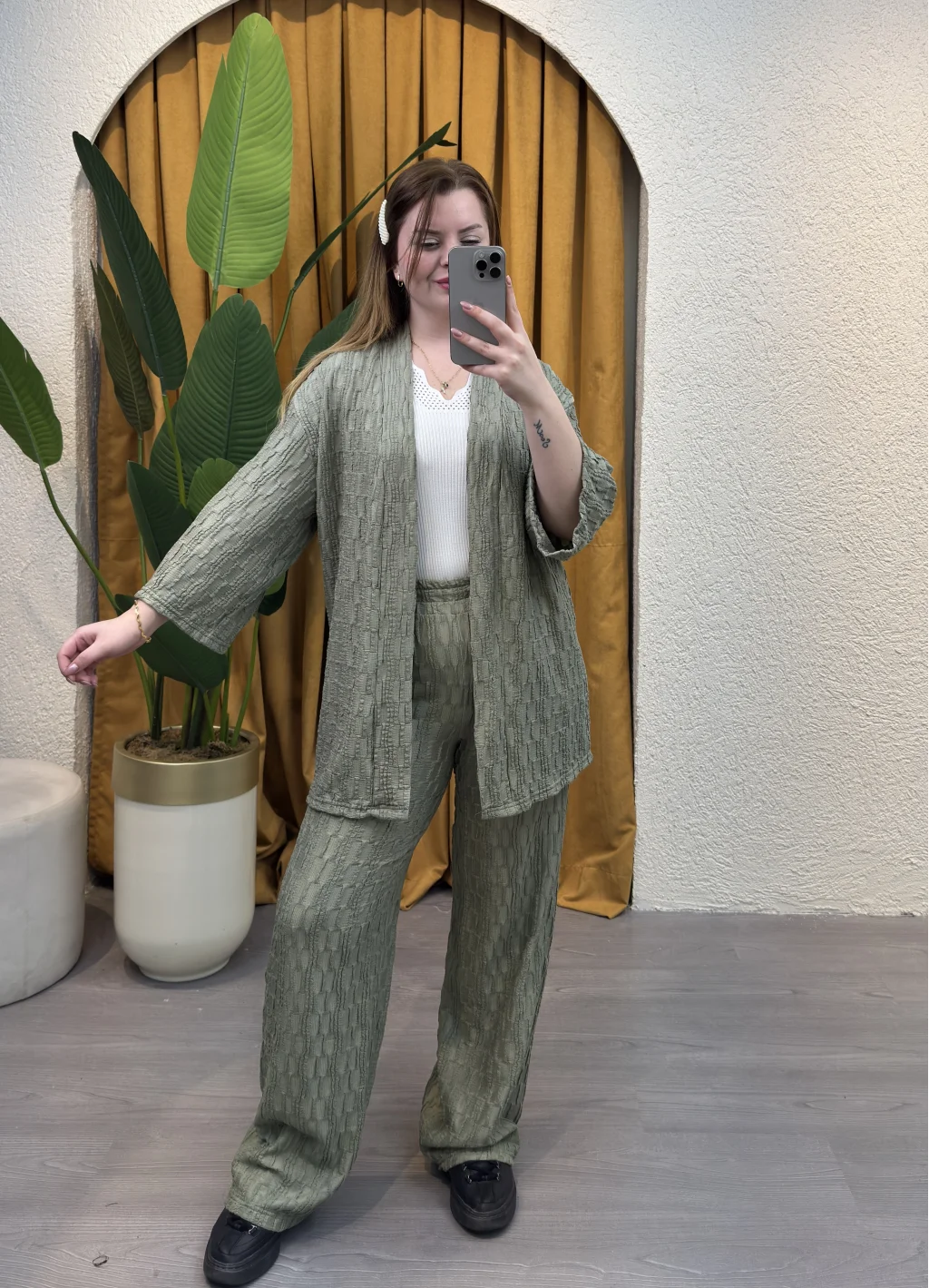 İçinde bulunduğumuz mevsime uygun şıklığı ve rahatlığı bir arada sunan Kare Moda'nın eşsiz tasarımı İkili Bürümcük Kimono Takımı ile tarzınızı konuşturun.