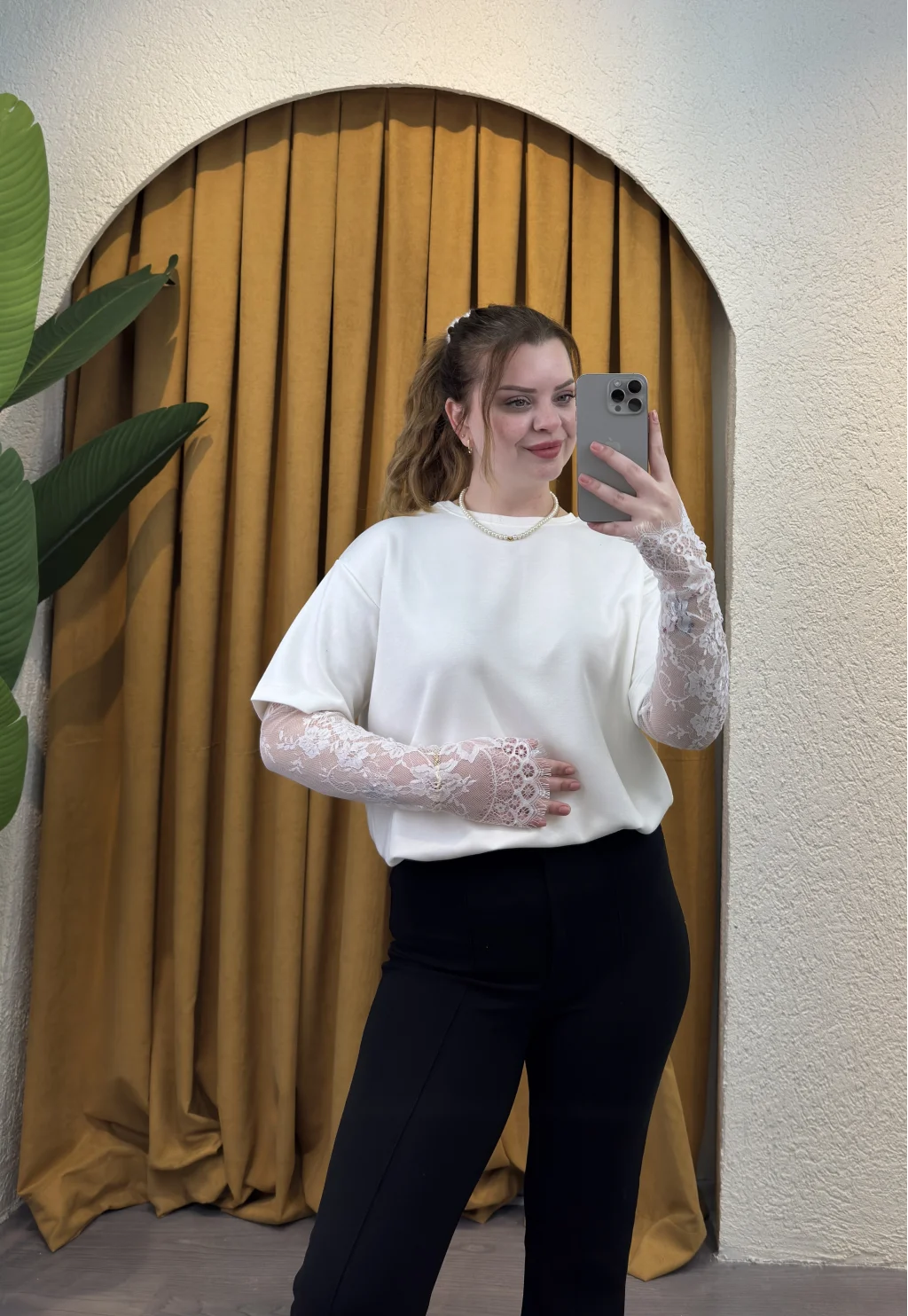 Şıklığı ve rahatlığı bir arada sunan Oversize Bilek Detay Dantel Kol T-Shirt, gardırobunuzun vazgeçilmez parçası olmaya aday!
