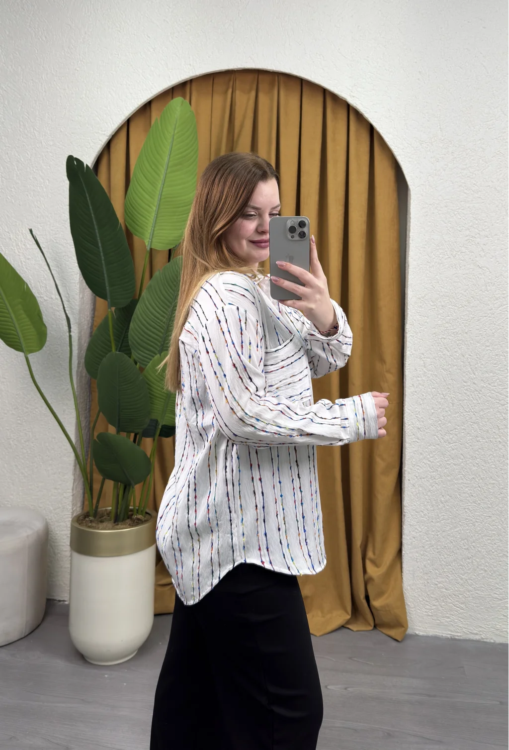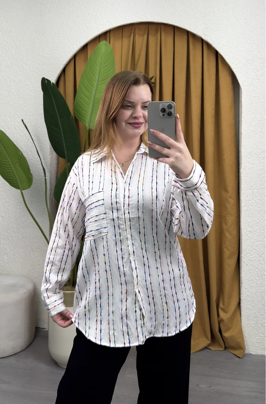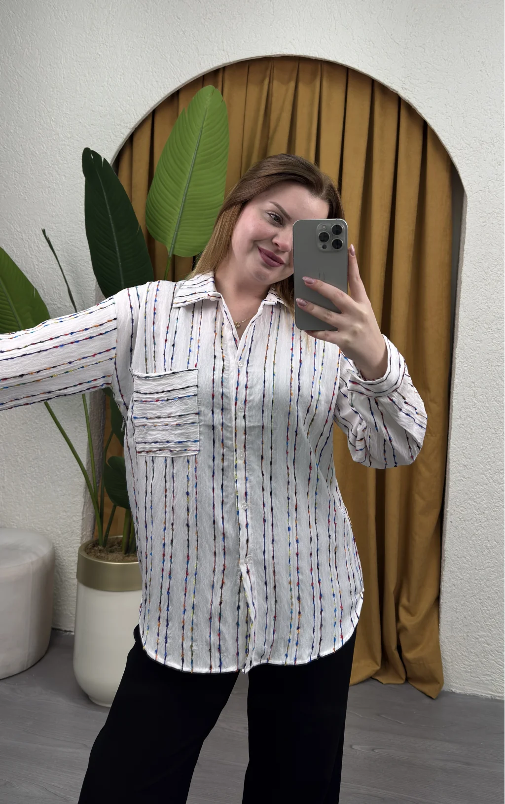 • BEYAZ Oversize Çizgili Gömlek, rahat ve şık görünümüyle öne çıkıyor. Tarzınızı yansıtacak bir seçim!