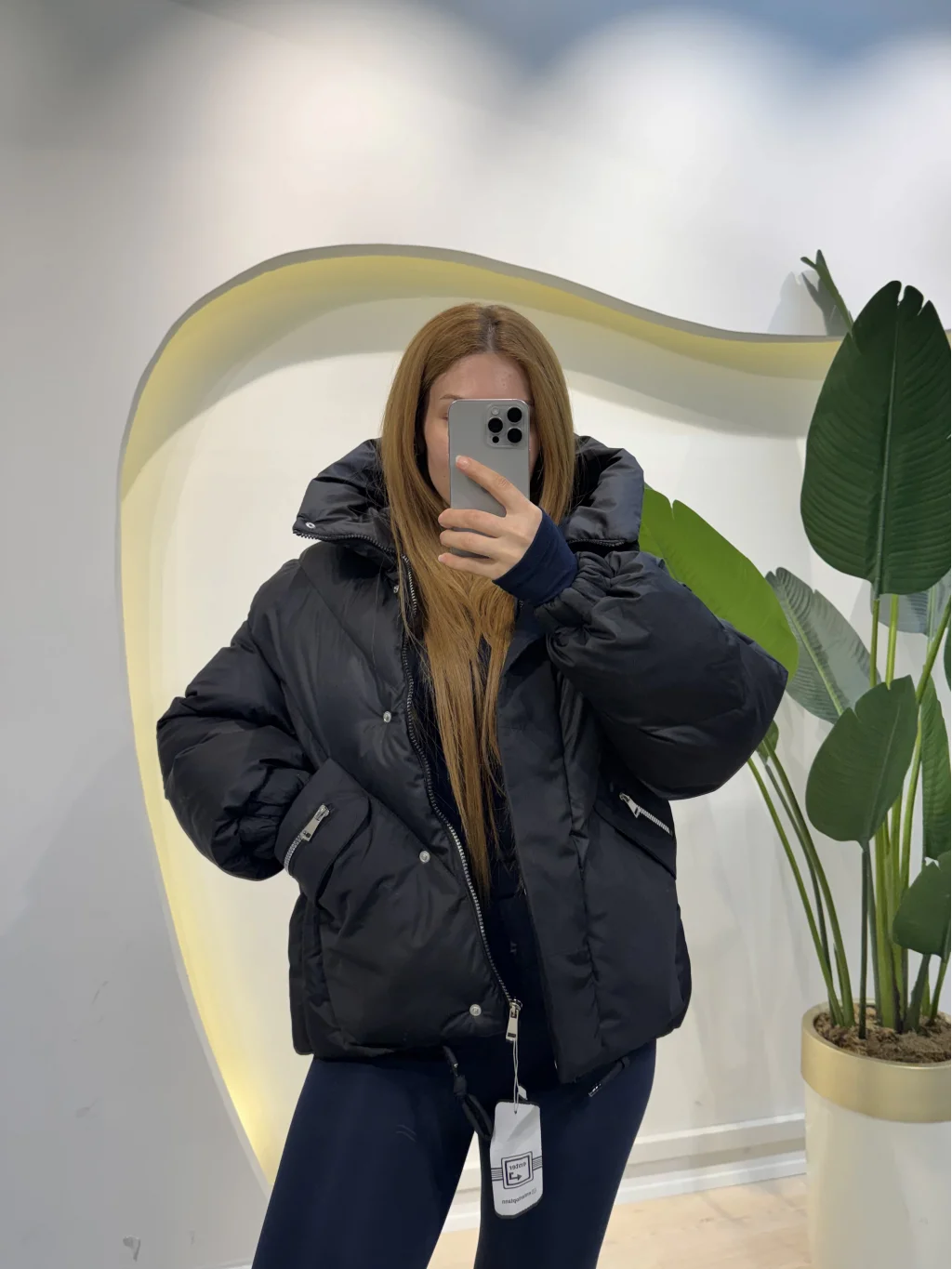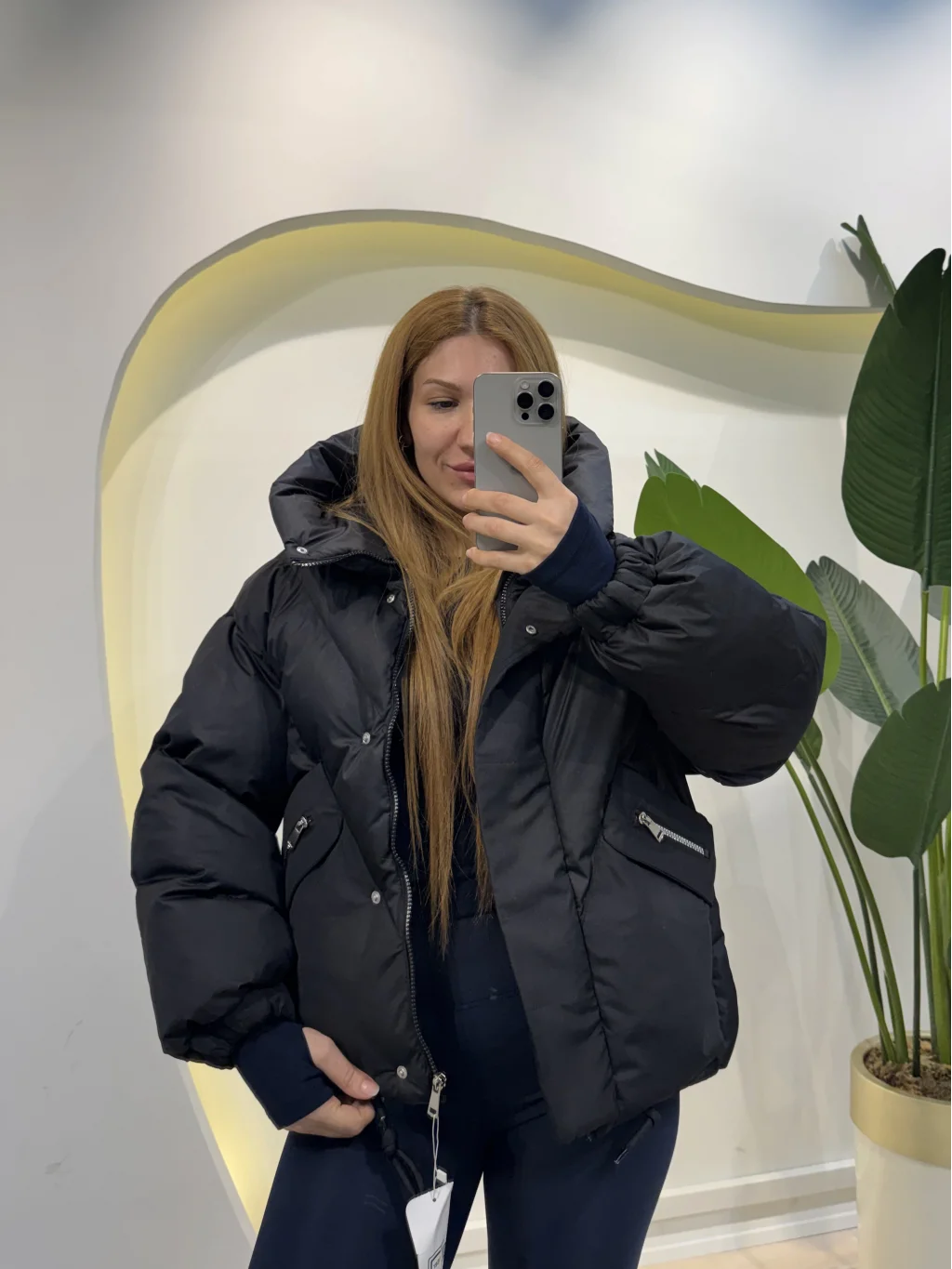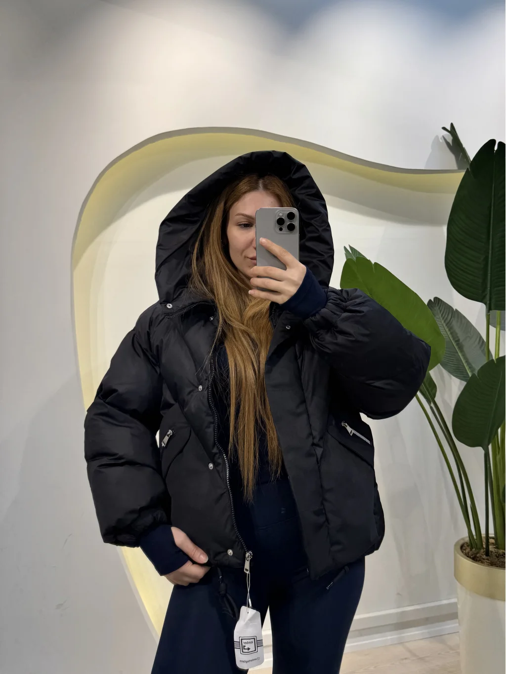 Oversize Kapüşonlu Şişme Mont - Siyah