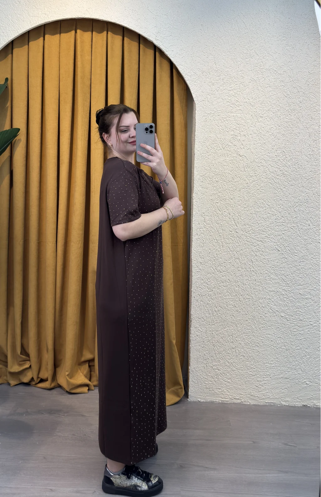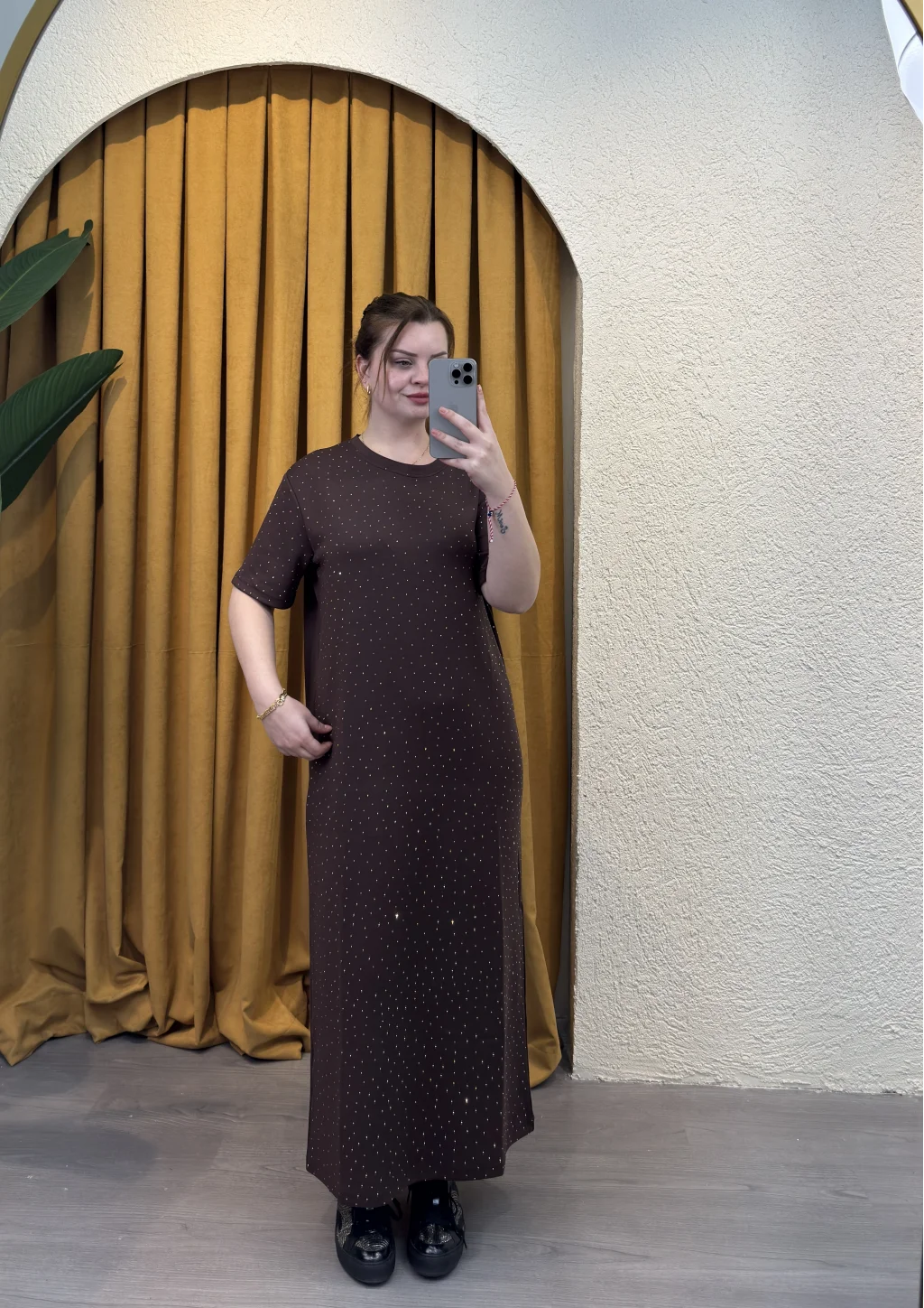 Taşlı Modal Shine Elbise - KAHVERENGİ